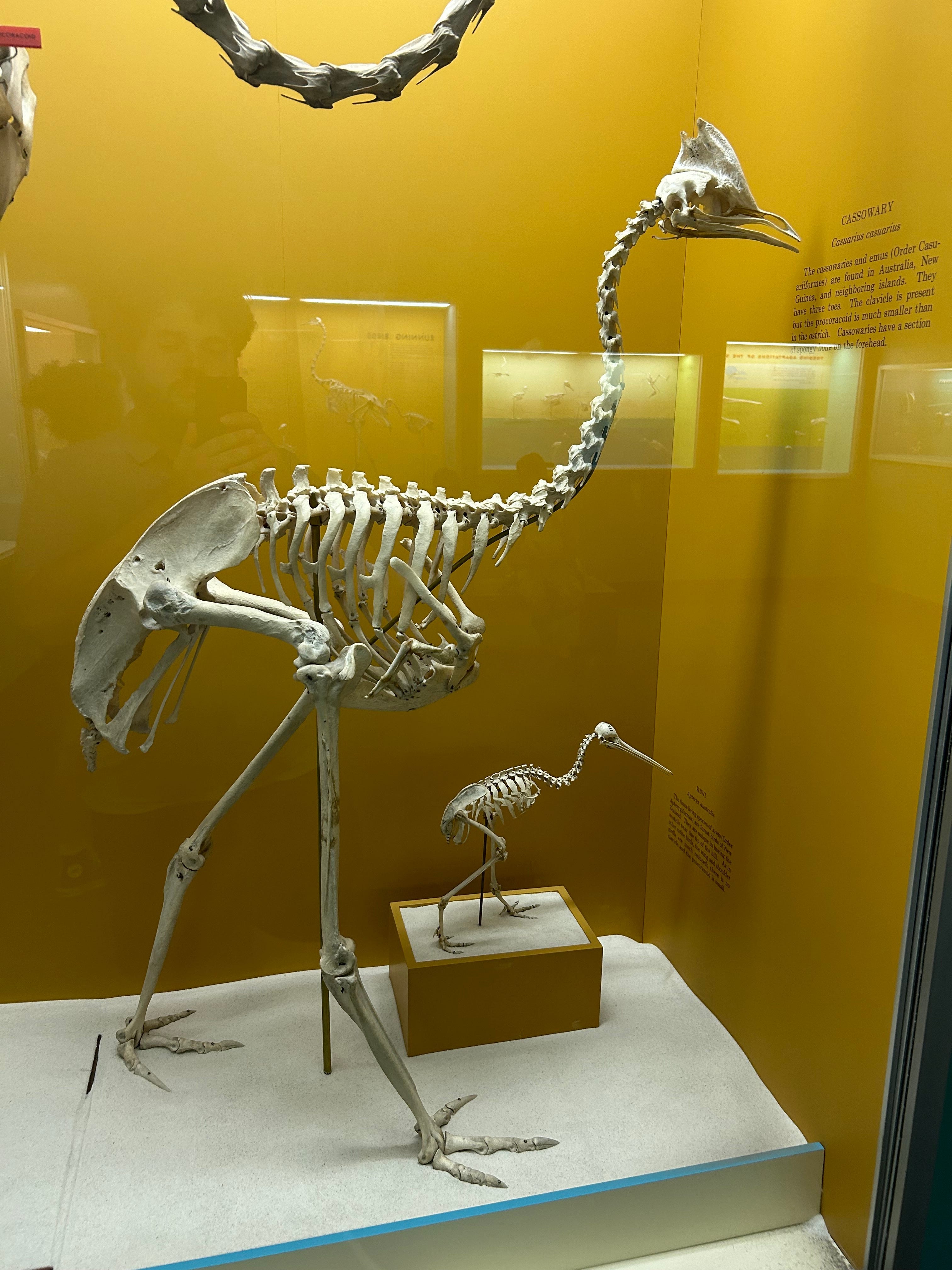 Figure (above): Mounted cassowary skeleton (left) showing the long legs, fragile bony ‘casque’, and the tiny, vestigial wings (check the front of the rib cage area). Specimen on display at the Smithsonian National Museum of Natural History, photo by Jack Stack.